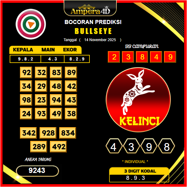 Prediksi Bullseye Hari Ini Selamat datang di prediksi Togel Bullseye 14 November . Pasaran Bulleye menawarkan pengalaman bermain yang unik dengan peluang besar untuk meraih kemenangan. Dengan prediksi yang tepat, Anda dapat memilih angka-angka terbaik dan meningkatkan kesempatan untuk memenangkan hadiah. Beberapa kelebihan bermain di pasaran Bullseye : Pasaran dengan potensi angka spesial yang akan […]